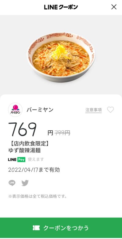 店内飲食限定 ゆず酸辣湯麺30円引き Published 2022年4月12日 at 400 × 781 in 【2024年2月最新】バーミヤンの割引クーポンまとめ情報 店内飲食限定 ゆず酸辣湯麺30円引き 広告 ← Previous Next →