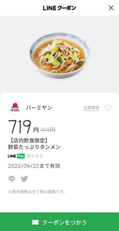店内飲食限定野菜たっぷりタンメン30円引き Published 2022年4月12日 at 400 × 778 in 【2024年2月最新】バーミヤンの割引クーポンまとめ情報 店内飲食限定野菜たっぷりタンメン30円引き 広告 ← Previous Next →