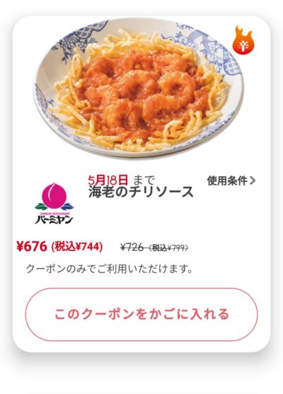海老のチリソース55円引き Published 2022年4月21日 at 400 × 557 in 【2024年2月最新】バーミヤンの割引クーポンまとめ情報 海老のチリソース55円引き 広告 ← Previous Next →