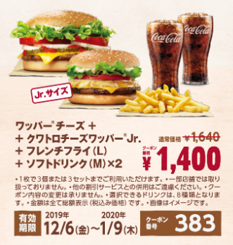 バーガーキングワッパーチーズ+クアトロチーズワッパーJr.+フレンチフライ(L)+ソフトドリンク(M)×2 240円引きクーポン Published 2019年12月6日 at 331 × 349 in 【2024年2月最新】バーガーキングの割引クーポン厳選まとめ情報 ワッパーチーズ+クアトロチーズワッパーJr.+フレンチフライ(L)+ソフトドリンク(M)×2 240円引き 広告 ← Previous Next →