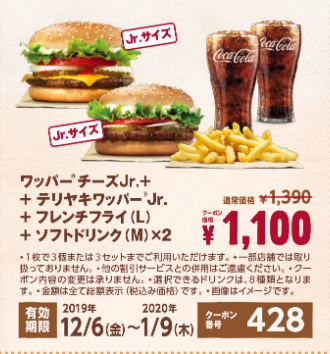 バーガーキングワッパーチーズJr.+テリヤキワッパーJr.+フレンチフライ(L)+ソフトドリンク(M)×2 290円引きクーポン Published 2019年12月6日 at 330 × 354 in 【2024年2月最新】バーガーキングの割引クーポン厳選まとめ情報 ワッパーチーズJr.+テリヤキワッパーJr.+フレンチフライ(L)+ソフトドリンク(M)×2 290円引き 広告 ← Previous Next →