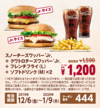 バーガーキングスノーチーズワッパーJr.+クアトロチーズワッパーjr.+フレンチフライ(L)+ソフトドリンク(M)×2 390円引きクーポン Published 2019年12月6日 at 320 × 347 in 【2024年2月最新】バーガーキングの割引クーポン厳選まとめ情報 スノーチーズワッパーJr.+クアトロチーズワッパーjr.+フレンチフライ(L)+ソフトドリンク(M)×2 390円引き 広告 ← Previous Next →
