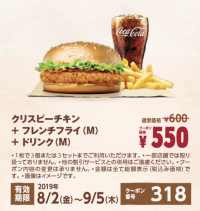 クリスピーチキン+ポテトM+ドリンクM50円引き Published 2019年8月5日 at 400 × 422 in 【2024年2月最新】バーガーキングの割引クーポン厳選まとめ情報 クリスピーチキン+ポテトM+ドリンクM50円引き 広告 ← Previous Next →