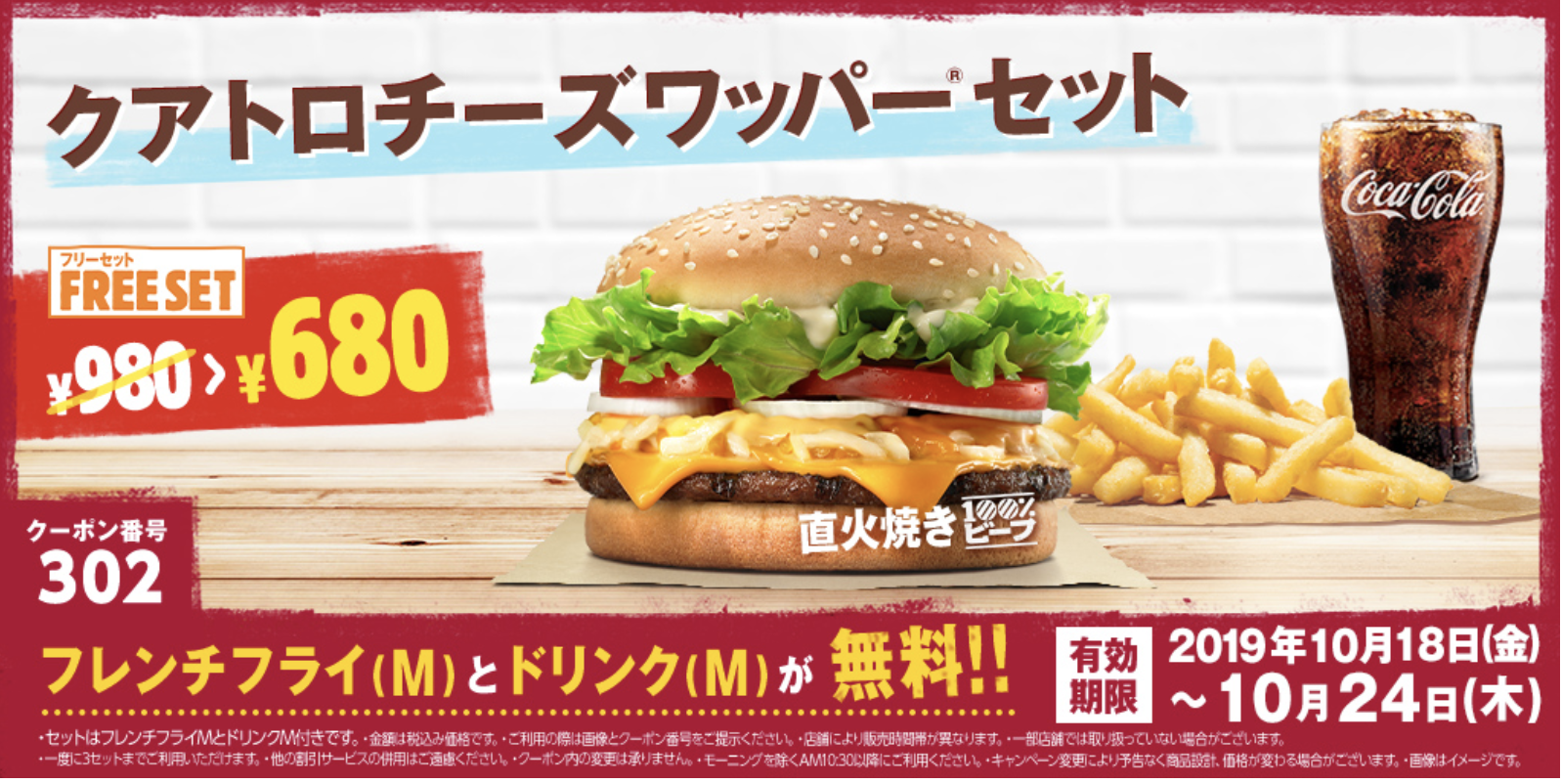 バーガーキングのクアトロチーズワッパーセット300円引きクーポン Published 2019年10月19日 at 1598 × 802 in 【2024年2月最新】バーガーキングの割引クーポン厳選まとめ情報 広告 ← Previous Next →