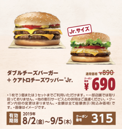 Wチーズ&QチーズワッパーJr200円引き Published 2019年8月5日 at 400 × 423 in 【2024年2月最新】バーガーキングの割引クーポン厳選まとめ情報 Wチーズ&QチーズワッパーJr200円引き 広告 ← Previous Next →