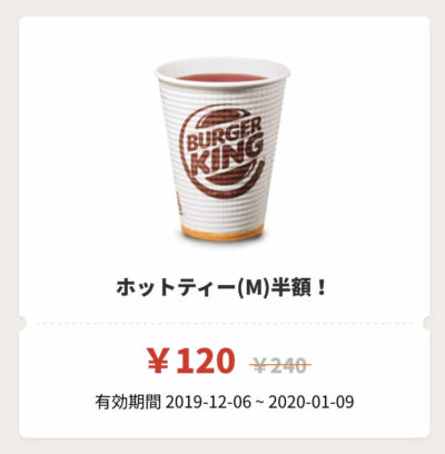 バーガーキングのホットティー(M)半額!120円引きクーポン Published 2019年12月6日 at 400 × 408 in 【2024年2月最新】バーガーキングの割引クーポン厳選まとめ情報 ホットティー(M)半額!120円引き 広告 ← Previous Next →