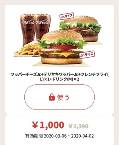 バーガーキングワッパーチーズJr.+テリヤキワッパーJr.+ポテトL+ドリンクM2 390円引きクーポン Published 2020年3月6日 at 400 × 486 in 【2024年2月最新】バーガーキングの割引クーポン厳選まとめ情報 ワッパーチーズJr.+テリヤキワッパーJr.+ポテトL+ドリンクM2 390円引き 広告 ← Previous Next →
