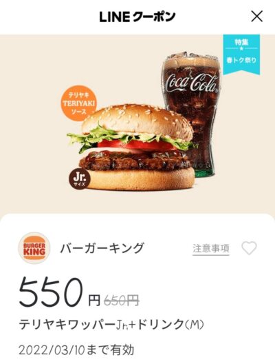 バーガーキング テリヤキワッパーjr+ドリンクM100円引き Published 2022年3月1日 at 400 × 528 in 【2024年2月最新】バーガーキングの割引クーポン厳選まとめ情報 テリヤキワッパーjr+ドリンクM100円引き 広告 ← Previous Next →