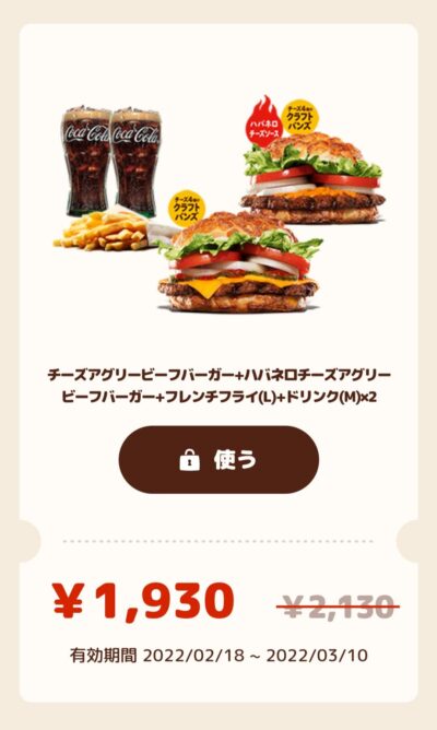 バーガーキングチーズアグリービーフバーガー+ハバネロチーズアグリービーフバーガー+フレンチフライL1+ドリンクM2 200円引き Published 2022年3月4日 at 400 × 668 in 【2024年2月最新】バーガーキングの割引クーポン厳選まとめ情報 チーズアグリービーフバーガー+ハバネロチーズアグリービーフバーガー+フレンチフライL1+ドリンクM2 200円引き 広告 ← Previous Next →