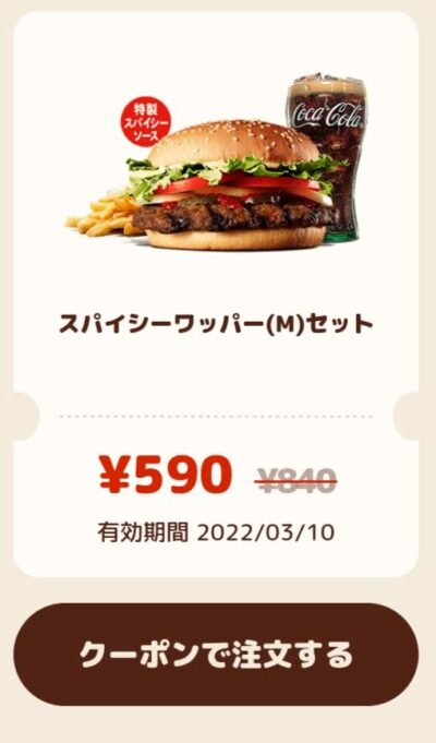 バーガーキングスパイシーワッパーMセット250円引き Published 2022年3月4日 at 400 × 681 in 【2024年2月最新】バーガーキングの割引クーポン厳選まとめ情報 スパイシーワッパーMセット250円引き 広告 ← Previous Next →