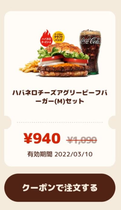 バーガーキングハバネロチーズアグリビーフバーガーMセット150円引き Published 2022年3月4日 at 400 × 694 in 【2024年2月最新】バーガーキングの割引クーポン厳選まとめ情報 ハバネロチーズアグリビーフバーガーMセット150円引き 広告 ← Previous Next →