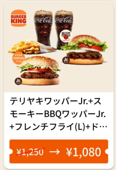 バーガーキングテリヤキワッパーJr.+スモーキーBBQワッパーJr+フレンチフライ(L)+ドリンクM×2.170円引き Published 2022年3月4日 at 400 × 584 in 【2024年2月最新】バーガーキングの割引クーポン厳選まとめ情報 テリヤキワッパーJr.+スモーキーBBQワッパーJr+フレンチフライ(L)+ドリンクM×2.170円引き 広告 ← Previous Next →