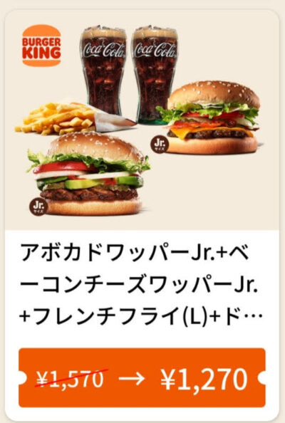 バーガーキングアボカドワッパーJr.+ベーコンチーズワッパーJr.+フレンチフライL+ドリンクM2 300円引き Published 2022年3月4日 at 400 × 594 in 【2024年2月最新】バーガーキングの割引クーポン厳選まとめ情報 アボカドワッパーJr.+ベーコンチーズワッパーJr.+フレンチフライL+ドリンクM2 300円引き 広告 ← Previous Next →