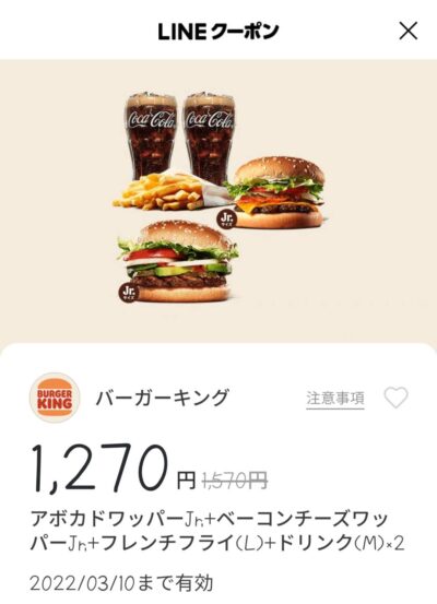 バーガーキングアボカドワッパーjr+ベーコンチーズワッパー jr +フレンチフライ(L)+ドリンクM2個 300円引き Published 2022年3月5日 at 400 × 553 in 【2024年2月最新】バーガーキングの割引クーポン厳選まとめ情報 バーガーキングアボカドワッパーjr+ベーコンチーズワッパー jr +フレンチフライ(L)+ドリンクM2個 300円引き 広告 ← Previous Next →