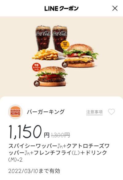 バーガーキングスパイシーワッパー jr+クアトロ チーズワッパーjr+ フレンチフライ(L)+ドリンクM2個 150円引き Published 2022年3月5日 at 400 × 585 in 【2024年2月最新】バーガーキングの割引クーポン厳選まとめ情報 スパイシーワッパー jr+クアトロ チーズワッパーjr+ フレンチフライ(L)+ドリンクM2個 150円引き 広告 ← Previous Next →