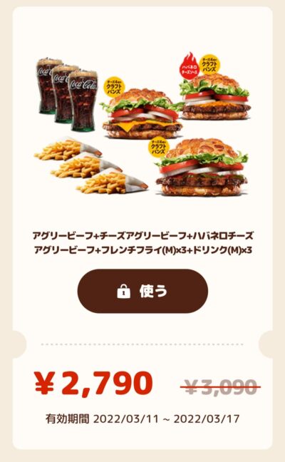 バーガーキングアグリービーフ+チーズアグリービーフ+ハバネロチーズアグリービーフ+フレンチフライM3+ドリンクM3 300円引き