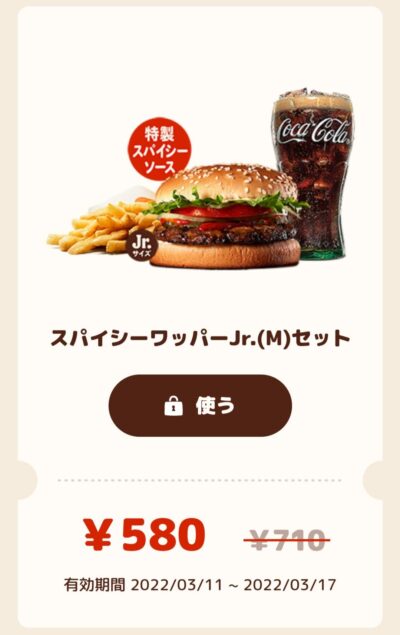 バーガーキングスパイシーワッパーJrMセット130円引き Published 2022年3月13日 at 400 × 635 in 【2024年2月最新】バーガーキングの割引クーポン厳選まとめ情報 スパイシーワッパーJrMセット130円引き 広告 ← Previous Next →