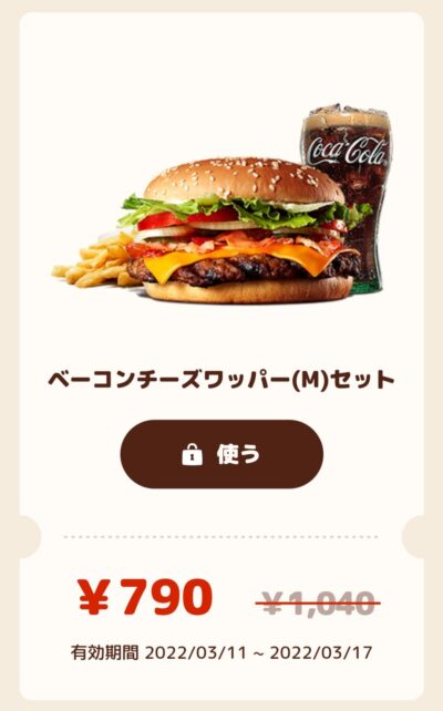 バーガーキングベーコンチーズワッパーMセット250円引き Published 2022年3月13日 at 400 × 642 in 【2024年2月最新】バーガーキングの割引クーポン厳選まとめ情報 ベーコンチーズワッパーMセット250円引き 広告 ← Previous Next →