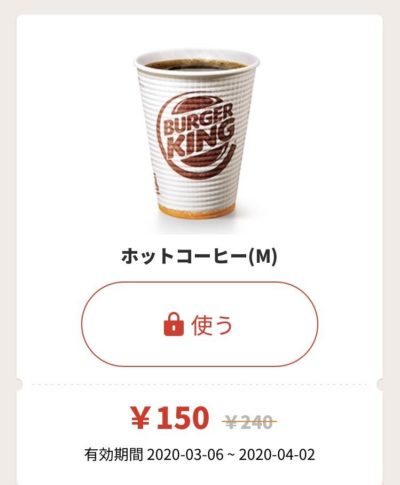 バーガーキングホットコーヒーM90円引きクーポン Published 2020年3月6日 at 400 × 485 in 【2024年2月最新】バーガーキングの割引クーポン厳選まとめ情報 ホットコーヒーM90円引き 広告 ← Previous Next →
