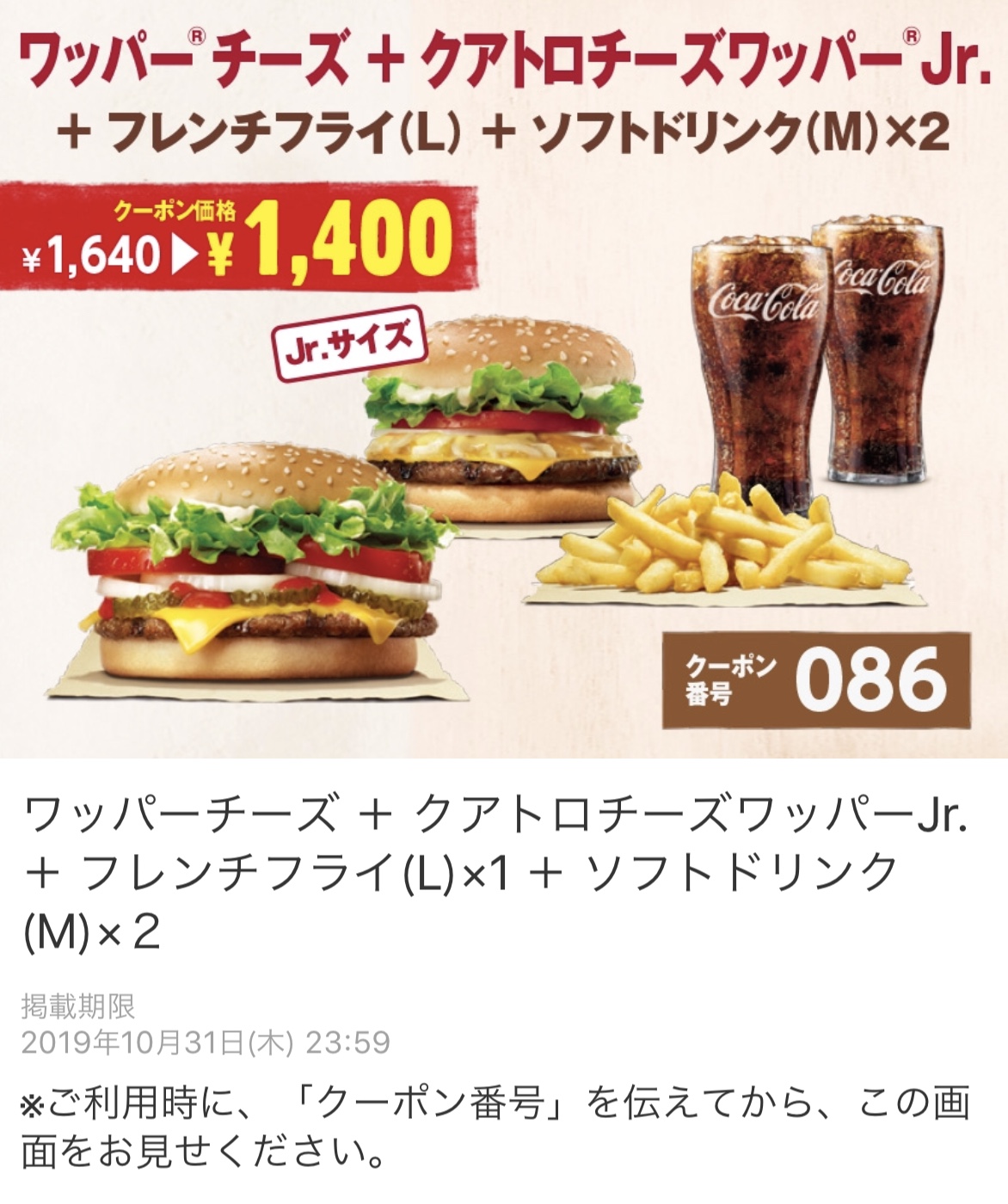 バーガーキングのワッパーチーズとクアトロチーズワッパーJrの240円引きクーポン Published 2019年10月19日 at 1172 × 1400 in 【2024年2月最新】バーガーキングの割引クーポン厳選まとめ情報 広告 ← Previous Next →