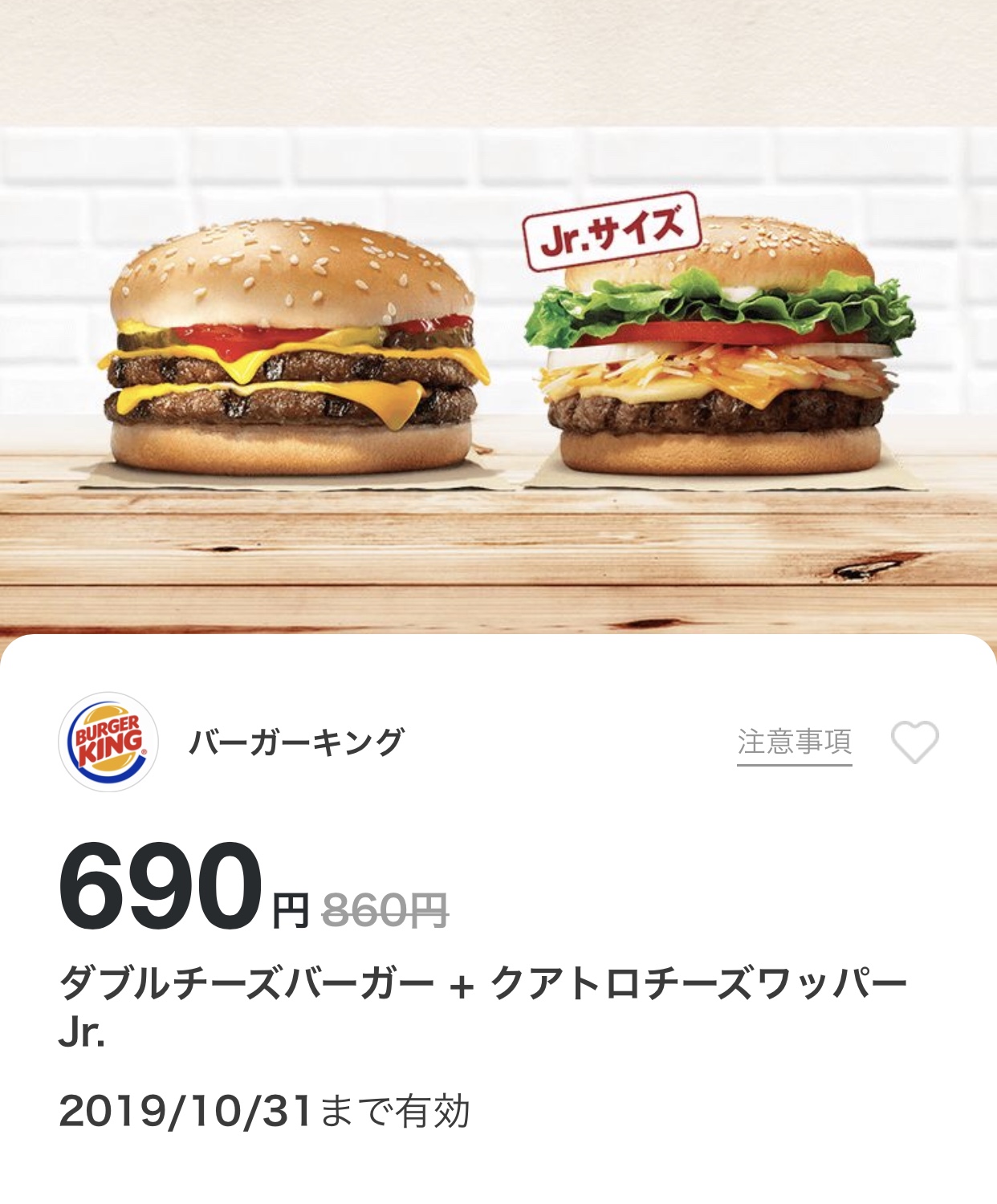 バーガーキングのダブルチーズバーガーとクアトロチーズワッパーJr170円引きクーポン Published 2019年10月19日 at 1242 × 1500 in 【2024年2月最新】バーガーキングの割引クーポン厳選まとめ情報 広告 ← Previous Next →