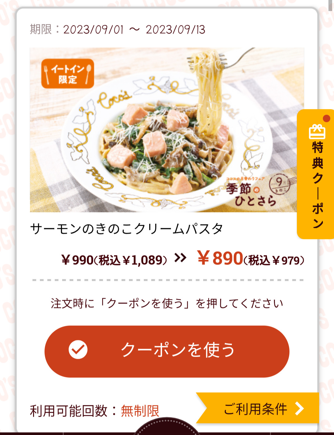 Screenshot_2023-09-06-15-16-16-85_d6d3ea1d5f9b7c618dc3c63d0f6afae5 Published 2023年9月6日 at 1080 × 1405 in 【2024年2月最新】ココスの割引クーポンまとめ情報 広告 ← Previous Next →
