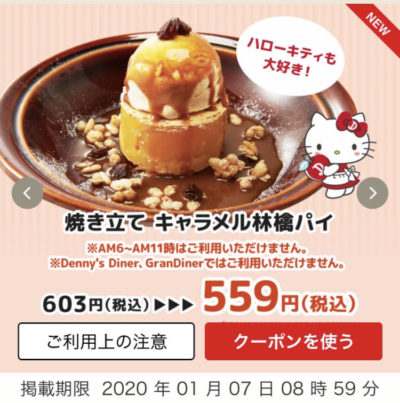 デニーズキャラメル林檎パイ44円引きクーポン Published 2019年12月31日 at 400 × 403 in 【2024年2月最新】デニーズの割引クーポンまとめ情報 キャラメル林檎パイ44円引き 広告 ← Previous Next →