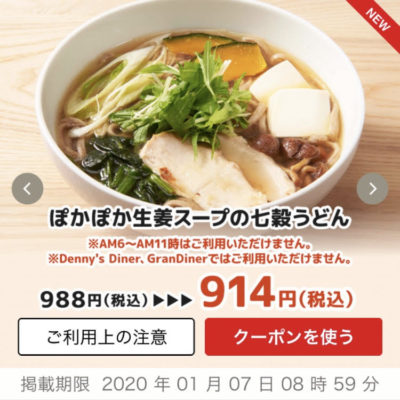 デニーズぽかぽか生姜スープの七穀うどん74円引きクーポン Published 2019年12月31日 at 400 × 400 in 【2024年2月最新】デニーズの割引クーポンまとめ情報 ぽかぽか生姜スープの七穀うどん74円引き 広告 ← Previous Next →