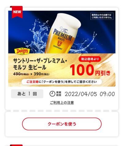 サントリー・ザ・プレミアムモルツ生ビール100円引き Published 2022年3月29日 at 400 × 475 in 【2024年2月最新】デニーズの割引クーポンまとめ情報 サントリー・ザ・プレミアムモルツ生ビール100円引き 広告 ← Previous Next →