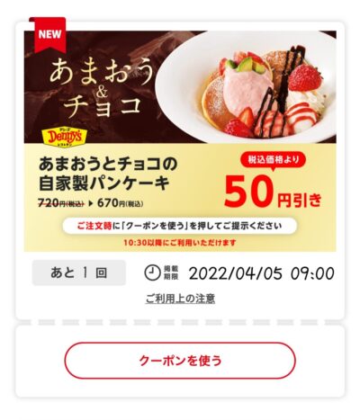 あまおうとチョコの自家製パンケーキ50円引き Published 2022年3月29日 at 400 × 467 in 【2024年2月最新】デニーズの割引クーポンまとめ情報 あまおうとチョコの自家製パンケーキ50円引き 広告 ← Previous Next →