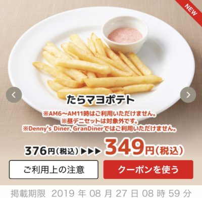 デニーズたらマヨポテト27円引き Published 2019年8月21日 at 400 × 393 in 【2024年2月最新】デニーズの割引クーポンまとめ情報 広告 ← Previous Next →