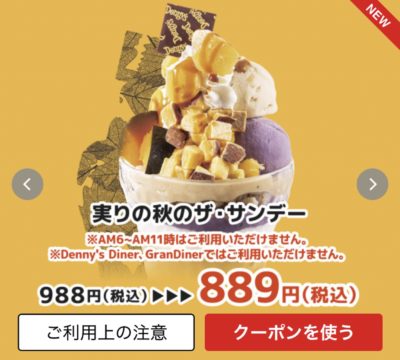 デニーズの実りの秋のザ・サンデー100円引きクーポン Published 2019年10月15日 at 400 × 360 in 【2024年2月最新】デニーズの割引クーポンまとめ情報 広告 ← Previous Next →