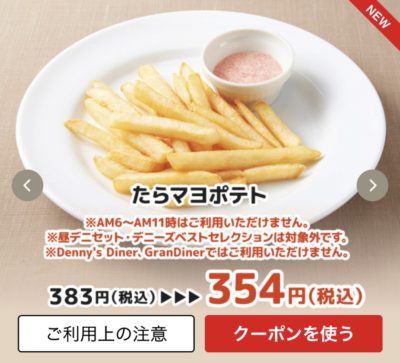 デニーズのたらマヨポテト29円引きクーポン Published 2019年10月15日 at 400 × 363 in 【2024年2月最新】デニーズの割引クーポンまとめ情報 広告 ← Previous Next →