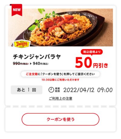 チキンジャンバラヤ50円引き Published 2022年4月7日 at 400 × 460 in 【2024年2月最新】デニーズの割引クーポンまとめ情報 チキンジャンバラヤ50円引き 広告 ← Previous Next →