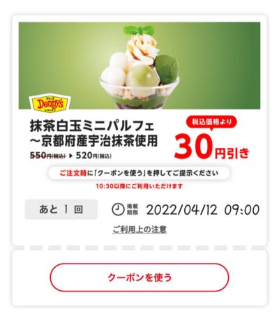 抹茶白玉ミニパルフェ30円引き Published 2022年4月7日 at 400 × 456 in 【2024年2月最新】デニーズの割引クーポンまとめ情報 抹茶白玉ミニパルフェ30円引き 広告 ← Previous Next →
