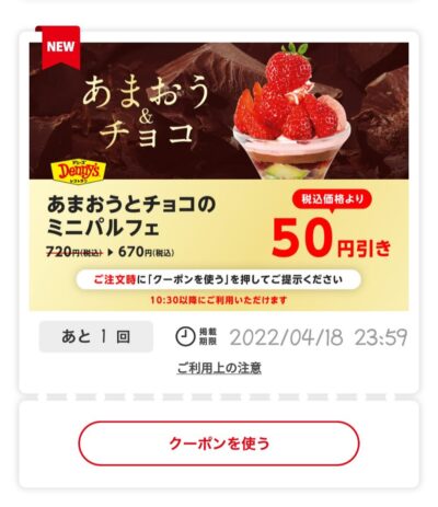 あまおうとチョコのミニパルフェ50円引き Published 2022年4月13日 at 400 × 463 in 【2024年2月最新】デニーズの割引クーポンまとめ情報 あまおうとチョコのミニパルフェ50円引き 広告 ← Previous Next →