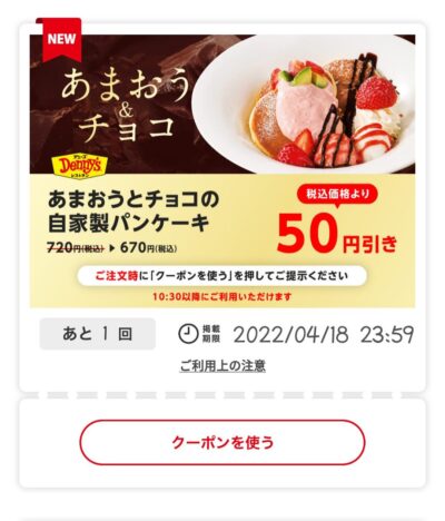 あまおうとチョコの自家製パンケーキ50円引き Published 2022年4月13日 at 400 × 468 in 【2024年2月最新】デニーズの割引クーポンまとめ情報 あまおうとチョコの自家製パンケーキ50円引き 広告 ← Previous Next →