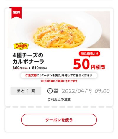 4種チーズのカルボナーラ50円引き Published 2022年4月13日 at 400 × 469 in 【2024年2月最新】デニーズの割引クーポンまとめ情報 4種チーズのカルボナーラ50円引き 広告 ← Previous Next →