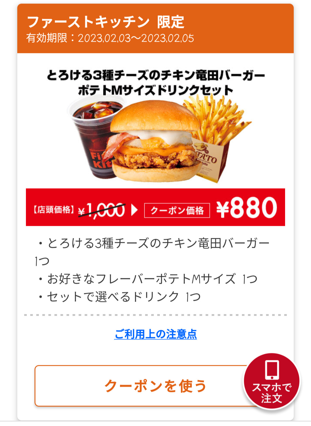 Screenshot_2023-02-04-18-07-25-47_4f596d53fa4b0012360217ddb2679274 Published 2023年2月4日 at 1080 × 1479 in 【2024年2月最新】ファーストキッチンの割引クーポンまとめ情報! 広告 ← Previous Next →