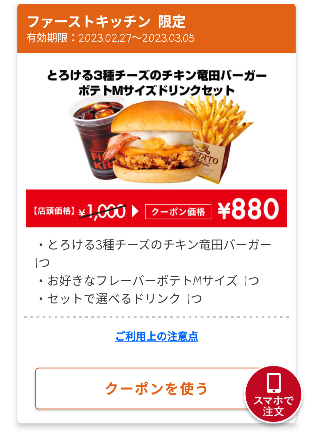 Screenshot_2023-02-28-15-28-49-18_4f596d53fa4b0012360217ddb2679274 Published 2023年2月28日 at 1080 × 1488 in 【2024年2月最新】ファーストキッチンの割引クーポンまとめ情報! 広告 ← Previous Next →