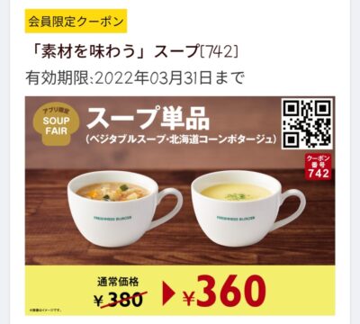 FRESHNESS BURGERスープ単品20円引き Published 2022年3月2日 at 400 × 360 in 【2024年2月最新】FRESHNESS BURGER割引クーポンまとめ情報 スープ単品20円引き 広告 ← Previous Next →