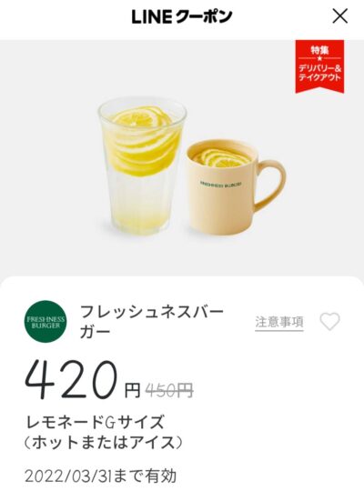 FRESHNESS BURGERレモネードGサイズ(ホット化アイス)30円引き Published 2022年3月16日 at 400 × 551 in 【2024年2月最新】FRESHNESS BURGER割引クーポンまとめ情報 レモネードGサイズ(ホット化アイス)30円引き 広告 ← Previous Next →