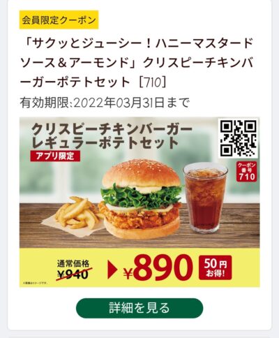 クリスピーチキンバーガーレギュラーポテトセット50円引き
