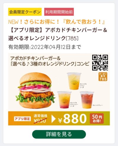 アボカドチキンバーガー選べる3種オレンジドリンクセット50円引き Published 2022年4月1日 at 400 × 492 in 【2024年2月最新】FRESHNESS BURGER割引クーポンまとめ情報 アボカドチキンバーガー選べる3種オレンジドリンクセット50円引き 広告 ← Previous Next →