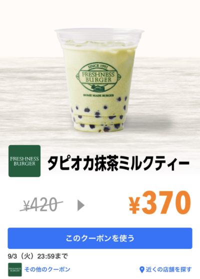 タピオカ抹茶ミルクティー50円引き Published 2019年8月8日 at 400 × 558 in 【2024年2月最新】FRESHNESS BURGER割引クーポンまとめ情報 タピオカ抹茶ミルクティー50円引き 広告 ← Previous Next →