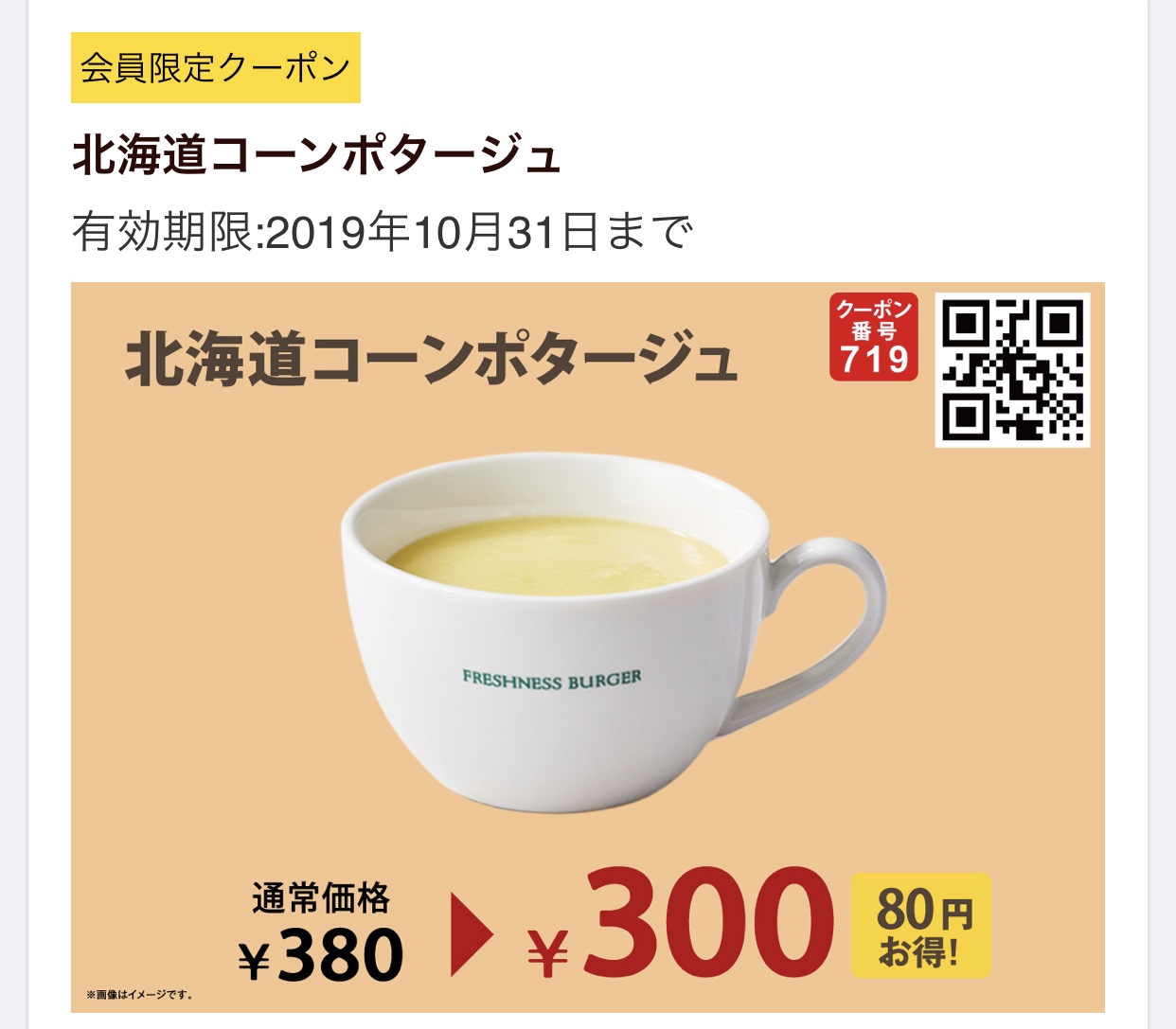 フレッシュネスバーガーの北海道コーンポタージュ80円引きクーポン Published 2019年10月19日 at 1242 × 1087 in 【2024年2月最新】FRESHNESS BURGER割引クーポンまとめ情報 広告 ← Previous Next →