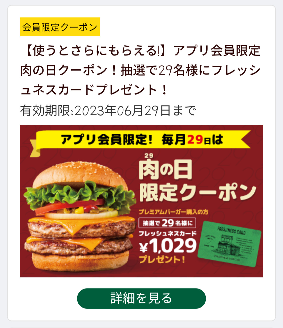 Screenshot_2023-06-29-17-31-50-94_ca48132a0f46477ba28d6f0b5d191127 Published 2023年6月29日 at 1080 × 1253 in 【2024年2月最新】FRESHNESS BURGER割引クーポンまとめ情報 広告 ← Previous Next →