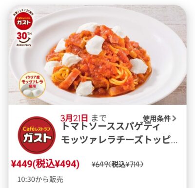 ガストトマトソーススパゲッティモッツァレラチーズトッピング220円引き Published 2022年3月17日 at 400 × 386 in 【2024年2月最新】ガストの割引クーポンコード・番号まとめ情報 トマトソーススパゲッティモッツァレラチーズトッピング220円引き 広告 ← Previous Next →