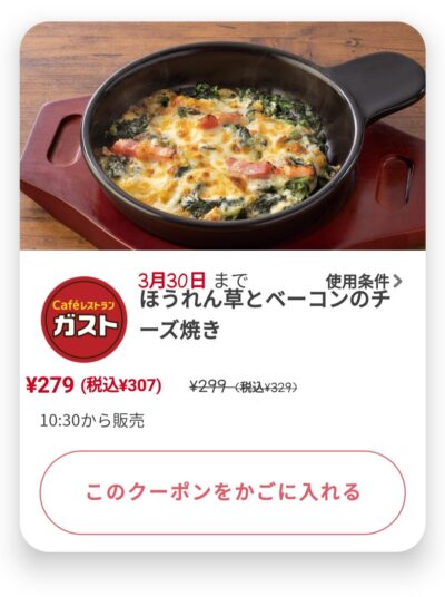 ほうれん草とベーコンのチーズ焼き22円引き Published 2022年3月24日 at 400 × 536 in 【2024年2月最新】ガストの割引クーポンコード・番号まとめ情報 ほうれん草とベーコンのチーズ焼き22円引き 広告 ← Previous Next →