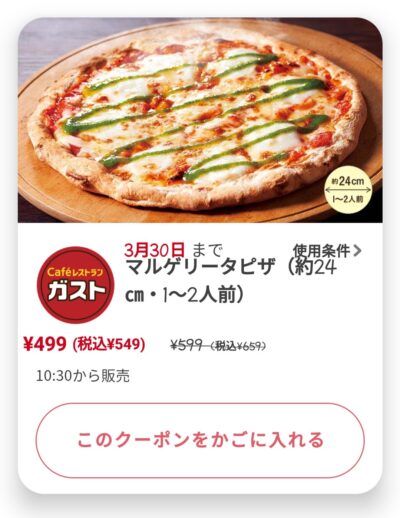 マルゲリータビザ(約24㎝・1~2人前)110円引き Published 2022年3月24日 at 400 × 518 in 【2024年2月最新】ガストの割引クーポンコード・番号まとめ情報 マルゲリータビザ(約24㎝・1~2人前)110円引き 広告 ← Previous Next →